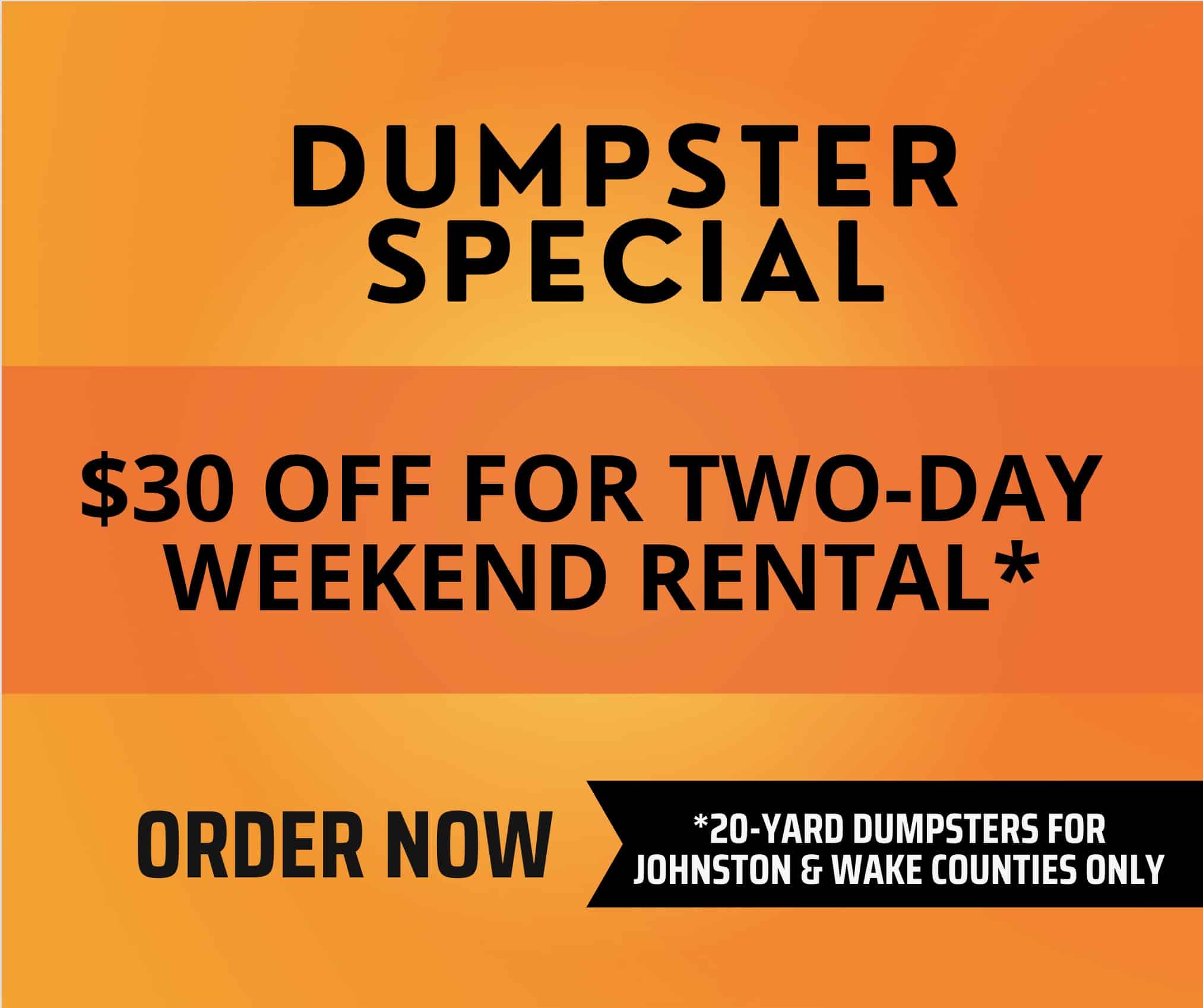 Large Dumpster = 20 Yards or 8 truck loads. 7.5-8′ wide x 14-15′ long x 5.5-6′ high. 2 Day Service. Charges include anything up to 3 tons. Choose a date below and then the County we are delivering to. Johnston and Wake County only.